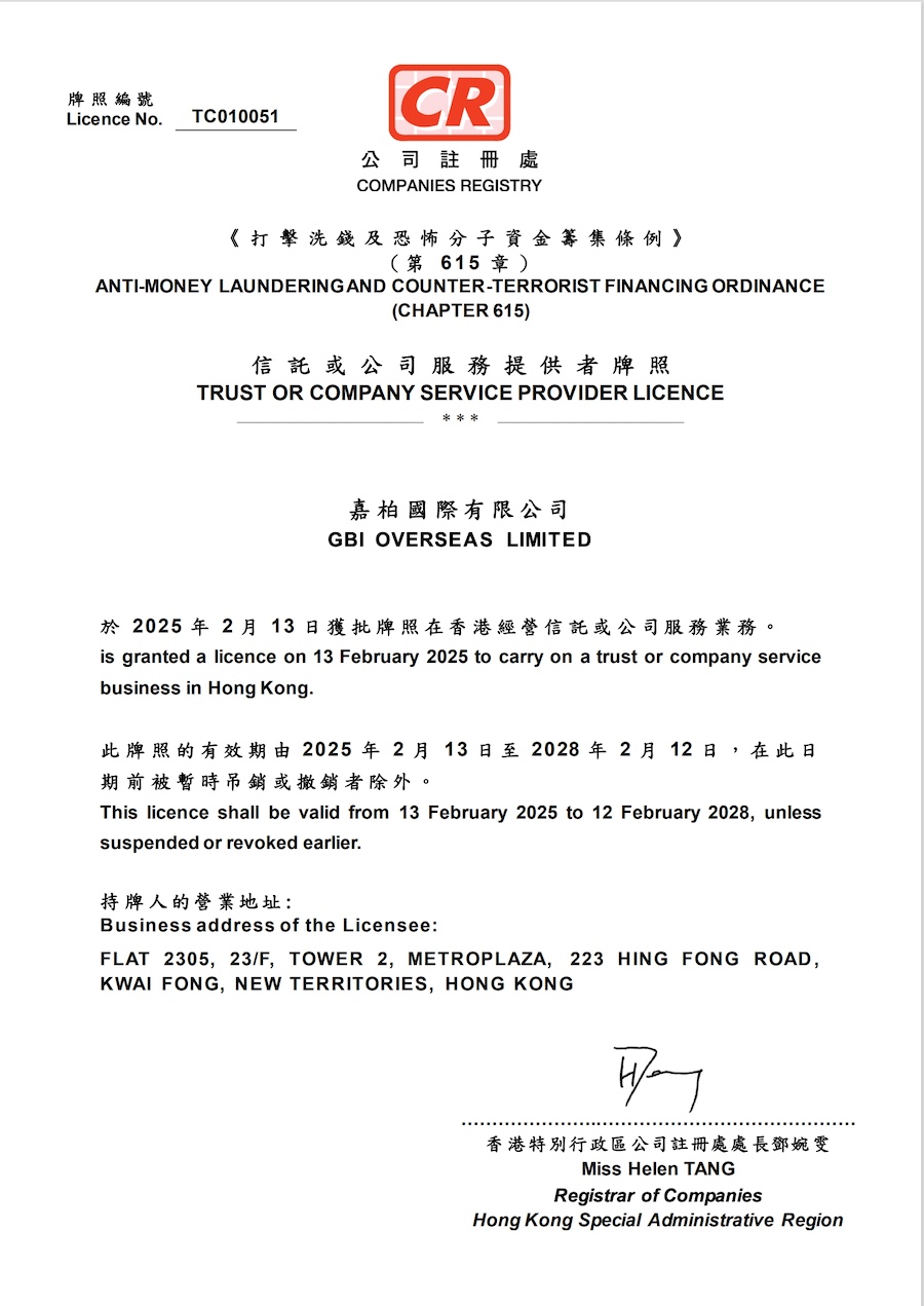 我們以風險為本的策略,以“客服控制權”為原則的服務交付標準,全流程服務無外包。 獲發全部由政府規管業務的牌照或許可,完全自主開發Complus港企+ 自助服務平台,完善的隱私保護及反洗錢政策, 港企Plus® 客戶自助平台信托及公司服務牌照資產管理牌照金錢服務經營者牌照保險經紀人牌照港企Plus® 客戶自助平台 港企Plus®客戶自主服務平台 公司注冊處對所有運營成立公司、管理、秘書、信托等類型服務的服務提供者進行規管,以監管反洗錢及可疑交易報告的主體責任。 公司作爲信托與公司服務持牌人,以制定並更新各項切實可行的政策制度保障企業服務的順利實施。 信托及公司服務牌照 信托與公司服務持牌人 編號:TC00051 公司注冊處對所有運營成立公司、管理、秘書、信托等類型服務的服務提供者進行規管,以監管反洗錢及可疑交易報告的主體責任。 公司作爲信托與公司服務持牌人,以制定並更新各項切實可行的政策制度保障企業服務的順利實施。 資產管理牌照 證監會資產管理持牌人 中央編號:N/A 公司注冊處對所有向本港公司提供成立、管理、秘書、信托等類型服務的服務提供者進行規管,以監管反洗錢及可疑交易報告的主體責任。 公司作爲信托與公司服務持牌人,以制定並更新各項切實可行的政策制度保障企業服務的順利實施。 金錢服務經營者牌照保險經紀人牌照