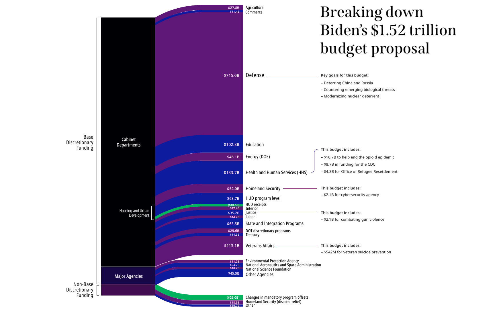 拜登于4月9日要求国会在今年晚些时候批准一项1.5万亿美元的联邦支出计划,力图政府机构通过巨额投资促进教育、扩大可负担住房、改善公共卫生情况和应对气候变化。