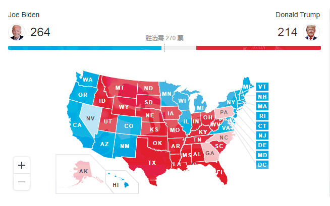 2020年11月8日,根据美国大选最新计票情况,拜登已经初步赢得大选。根据福克斯新闻,拜登连续拿下宾州、内华达州和亚利桑那州,选举人票达到290票。